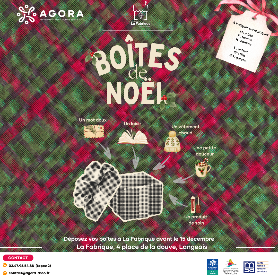 Culture • Art de vivre Ven. 31 Oct. 2025 Lun. 15 Déc. 2025 | 🔵 ✨ Les boites de Noël sont de retour ! ✨| Offrez un peu de 𝗰𝗵𝗮𝗹𝗲𝘂𝗿 et de 𝗿𝗲́𝗰𝗼𝗻𝗳𝗼𝗿𝘁 à ceux qui en ont besoin ❤️ Langeais • Centre social La Fabrique