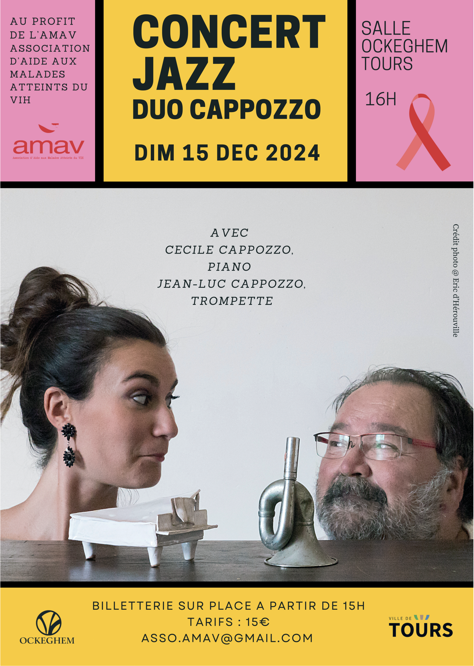 Jean-Luc Cappozzo, trompettiste improvisateur de renommée internationale sera accompagné au piano par sa fille Cécile Cappozzo qui est aussi danseuse-chorégraphe de flamenco. Standards de jazz et compositions de Cécile au programme de ce concert au profit de l’association d’aide aux malades atteints du VIH, AMAV.