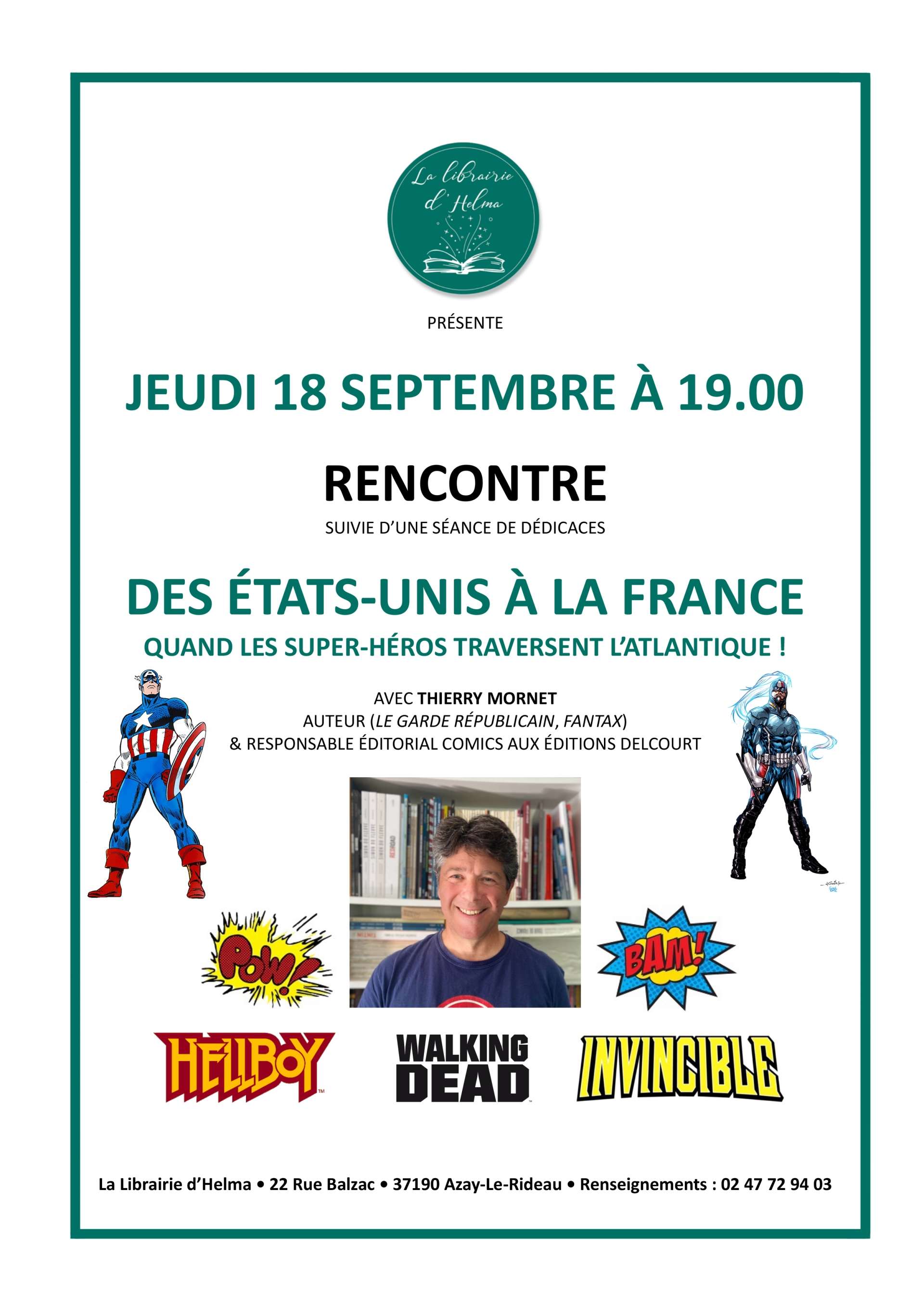 Facebook Twitter Linkedin Copier le lien Rencontre/Conférence • Culture Rencontre et dédicace Thierry Mornet ( auteur, éditeur et scénariste chez Delcourt) Des Etats-Unis à la France...Quand les Super-héros traversent l'Atlantique ! LIBRAIRIE D'HELMA Dédicace Jeu. 18 Sept. 2025 Azay-Le-Rideau - 37190 (France) • LA LIBRAIRIE D'HELMA | 19:00 à 21:00 Terminé (1) Rencontre et dédicace avec Thiery Mornet | Facebook 22 RUE BALZAC 37190 AZAY-LE-RIDEAU — 37190 Azay-Le-Rideau - 37190 (France) Organisateur LIBRAIRIES LIBRAIRIE D'HELMA 22 rue Balzac — 37190 Azay-le-Rideau Tous les évènements Vous devriez aimer... Culture • Rencontre/Conférence Jeu. 13 Nov. 2025 Jeu. 11 Juin 2026 Atelier “Fragments de moi” Tours • Espace de coworking Babel Caliss Culture • Rencontre/Conférence Mar. 06 Janv. 2026 Atelier fantaisies d'écriture Loches • MÉDIATHÈQUE JACQUES LANZMANN Culture • Rencontre/Conférence Sam. 03 Janv. 2026 Sam. 07 Févr. 2026 Blabla Tricot Saint Pierre des Corps • BIBLIOTHÈQUE DE SAINT-PIERRE-DES-CORPS Culture • Rencontre/Conférence Lun. 15 Déc. 2025 18:30 Pour les fêtes les femmes sont-elles à la fête ? Tours • La Crêpe au Carré