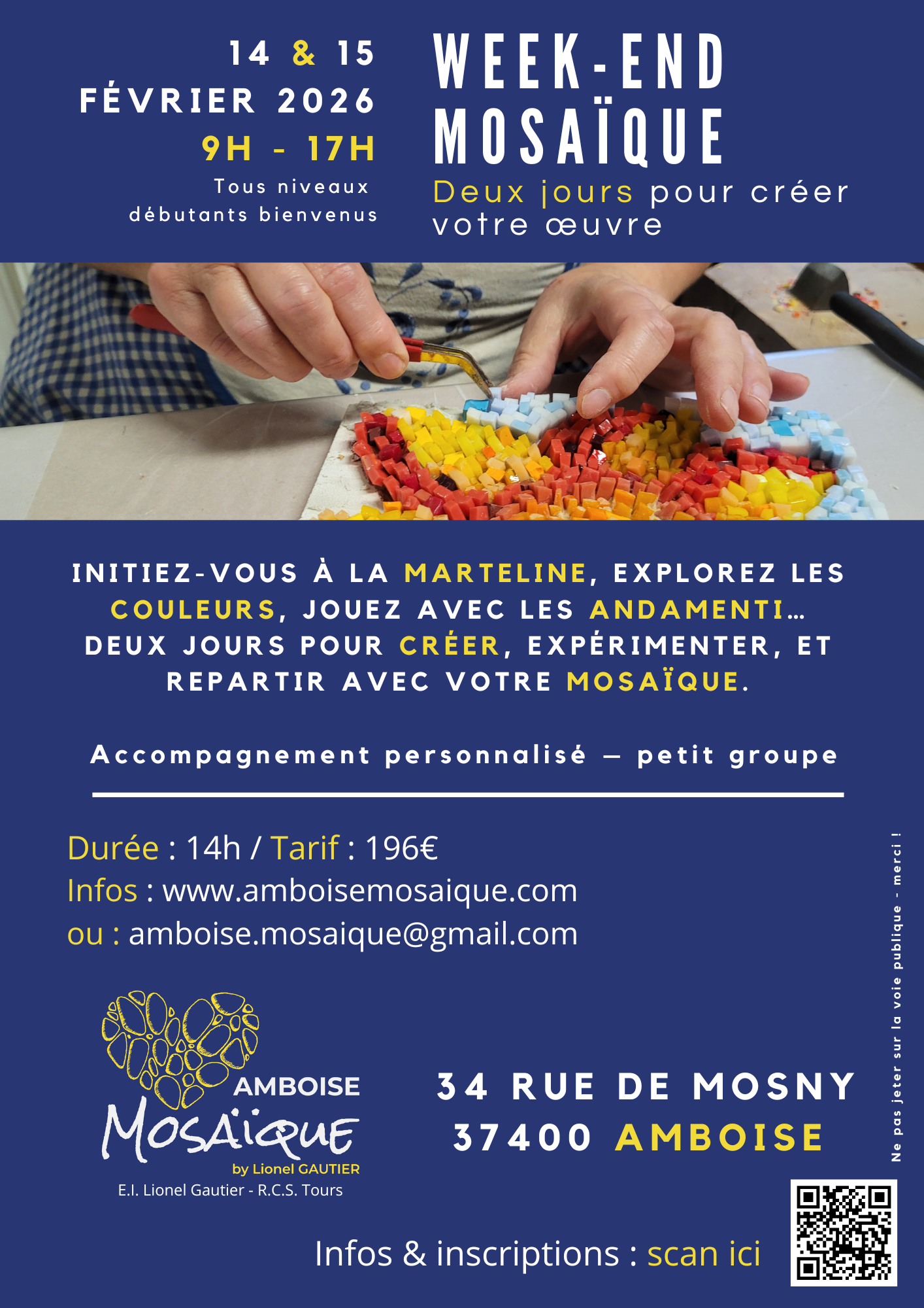 Situé à Amboise, mon atelier est dédié à l'art de la mosaïque, où je crée chaque pièce à la main avec la marteline, un outil traditionnel. J'y propose des cours hebdomadaires, des ateliers thématiques pour enfants et adultes, ainsi que la privatisation de l'atelier pour des moments entre amis ou en famille. En plus de ces offres, j'organise également des stages pour adultes et enfants, soit sur un week-end soit sur plusieurs jours, souvent pendant les vacances scolaires pour les plus jeunes. L'atelier comprend une boutique sur place et en ligne avec des créations uniques et des commandes personnalisées. Il est également possible de me contacter pour exposer mes créations. Chaque mosaïque est unique, numérotée et signée, assurant qualité et authenticité.